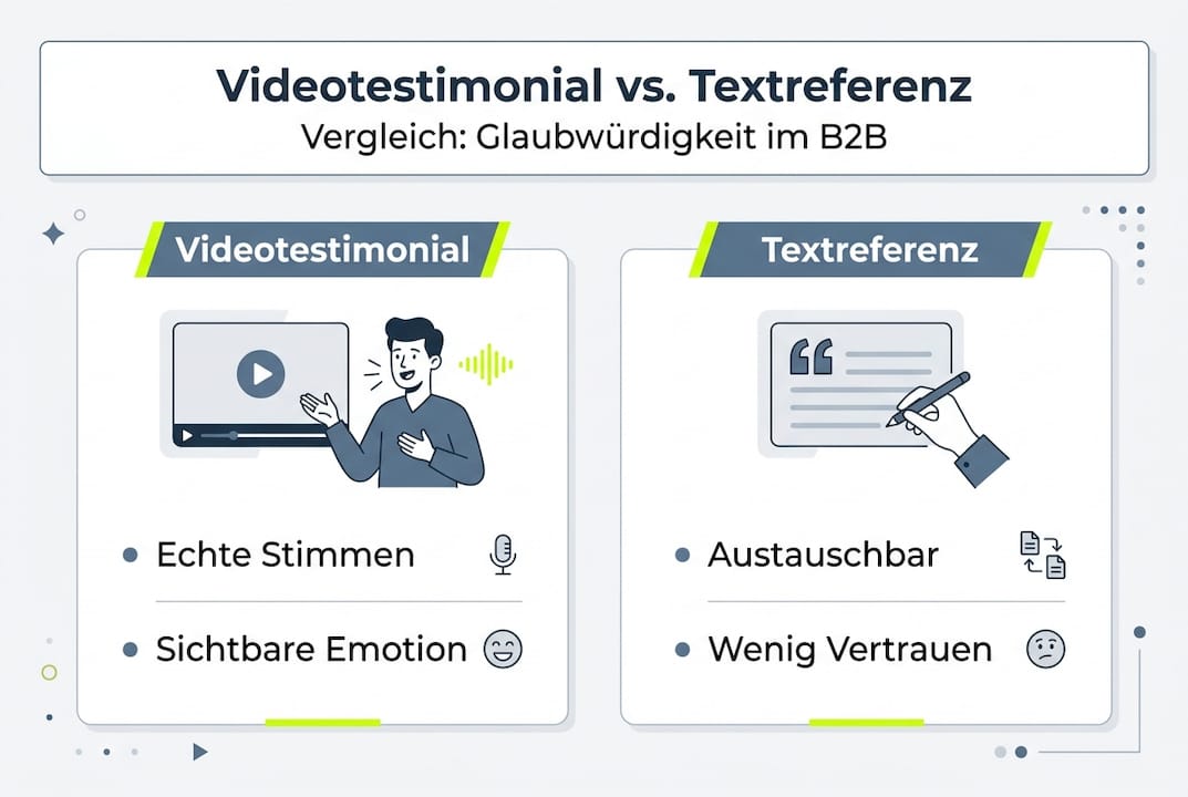 Der Unterschied zwischen einem Videotestimonial und einer klassischen Textreferenz ist fundamental. Text kann kopiert, verfälscht oder aus dem Kontext gerissen werden. Ein Video zeigt Mimik, Tonfall und echte Überzeugung. Entscheider, die ein Testimonial-Video sehen, erleben den Kunden als reale Person, nicht als anonymes Zitat. Genau das erzeugt Glaubwürdigkeit. Die Empfehlungs-Technik mit Testimonials erhöht nachweislich die Glaubwürdigkeit und baut Vertrauen im Verkaufsgespräch auf.