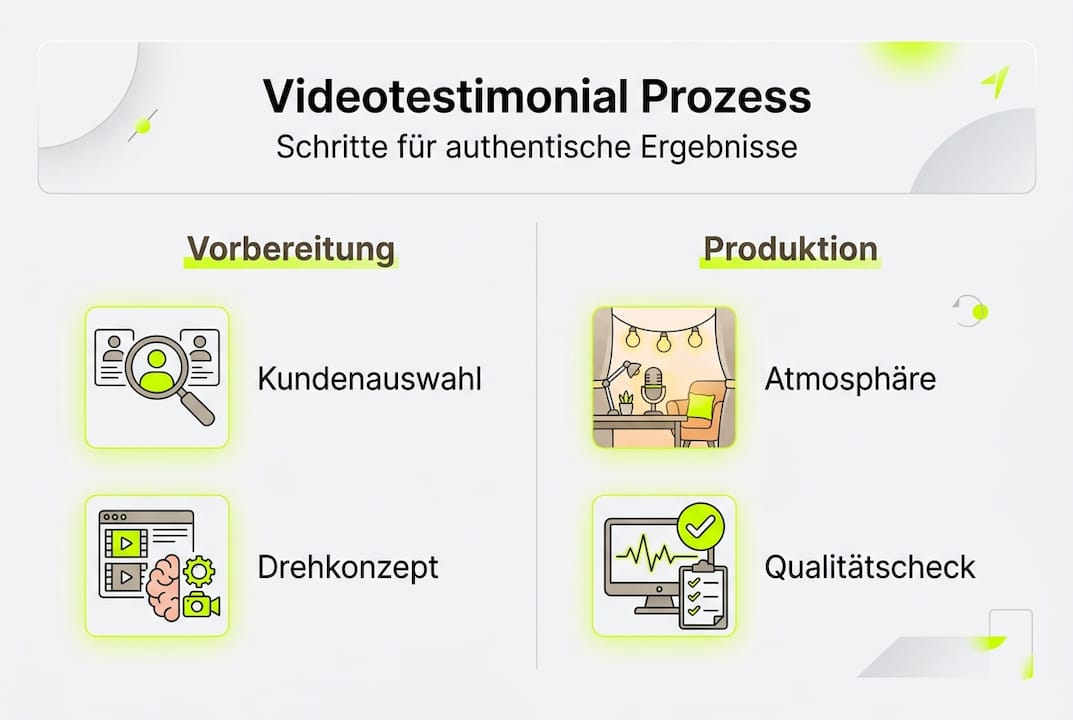 Die Produktion authentischer Videotestimonials folgt einem bewährten Prozess, der Professionalität mit Natürlichkeit verbindet. Jeder Schritt trägt dazu bei, die Geschichte Ihres Kunden überzeugend zu erzählen.