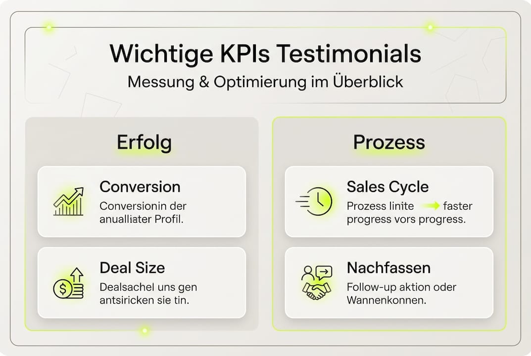 Wichtige KPIs für Videotestimonials umfassen Conversion Rate, durchschnittlichen Deal Size, Sales Cycle und Nachfassquote. Verkürzung des Sales Cycle um 27% und 350-650% ROI sind realistisch bei strategischem Einsatz.