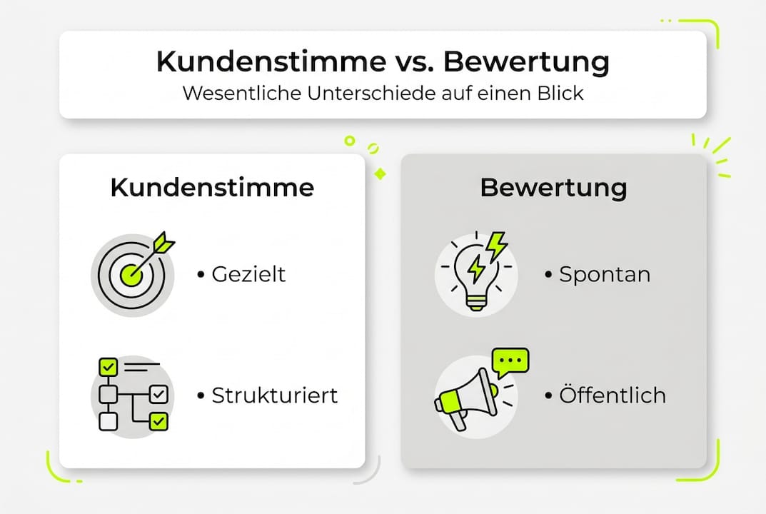 | Kundenstimme vs. Bewertung | Kundenstimme ist strategisch und tiefgehend, Bewertungen sind öffentlich und meist punktuell. |