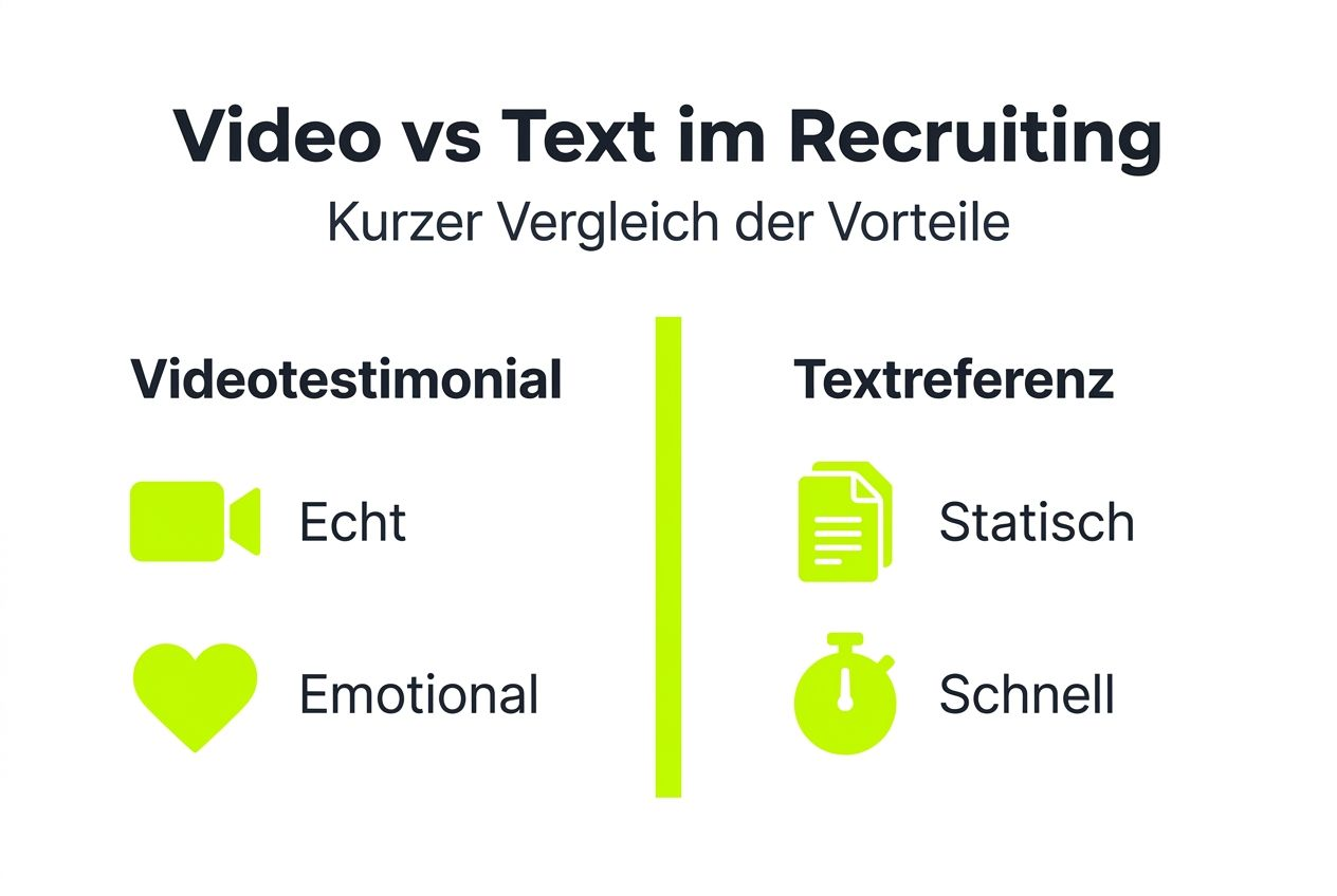 Textreferenzen haben durchaus ihre Berechtigung als ergänzende Elemente. Sie sind schnell erfassbar und SEO-optimierbar. Als alleiniges Instrument im Recruiting zeigen sie jedoch deutliche Schwächen. Bewerber scannen Texte oft nur oberflächlich, während sie Videos aktiv konsumieren.